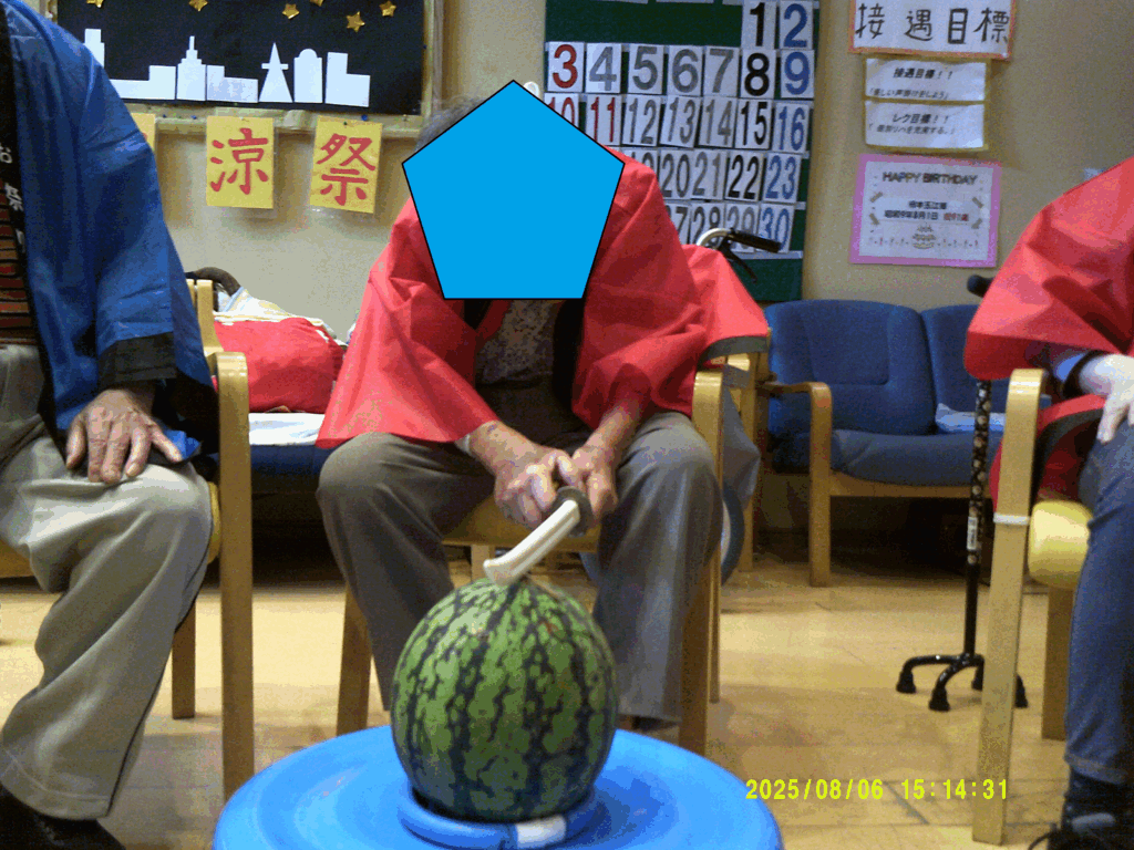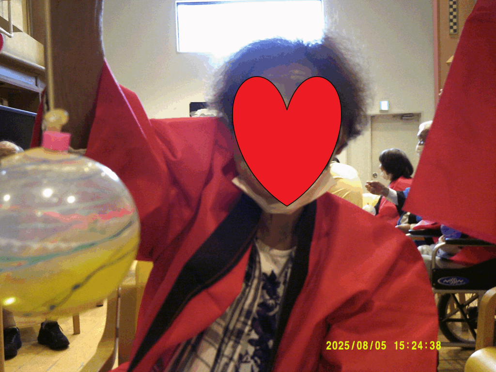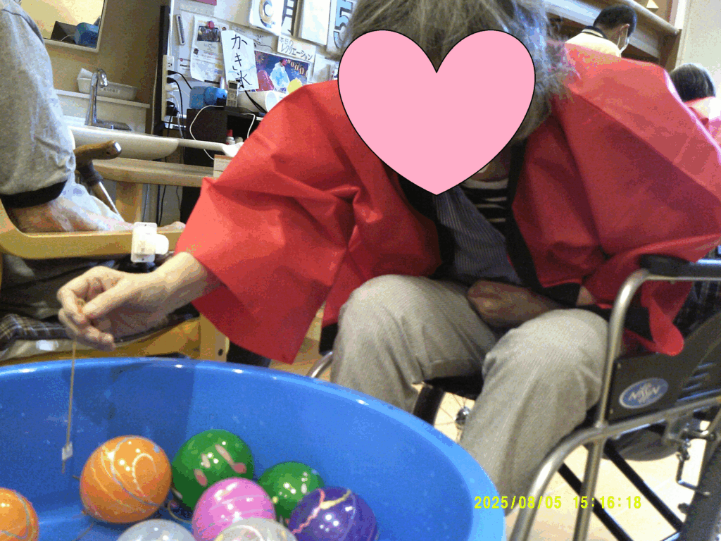 さくら庵では毎年恒例の夏祭りを開催しました。ヨーヨー掬いや、的当て、箱の中身当てゲームなど様々な出し物を楽しんで頂きました。また、その後のおやつの時間にはタコ焼きやかき氷を召し上がって頂きとても喜ばれていました。