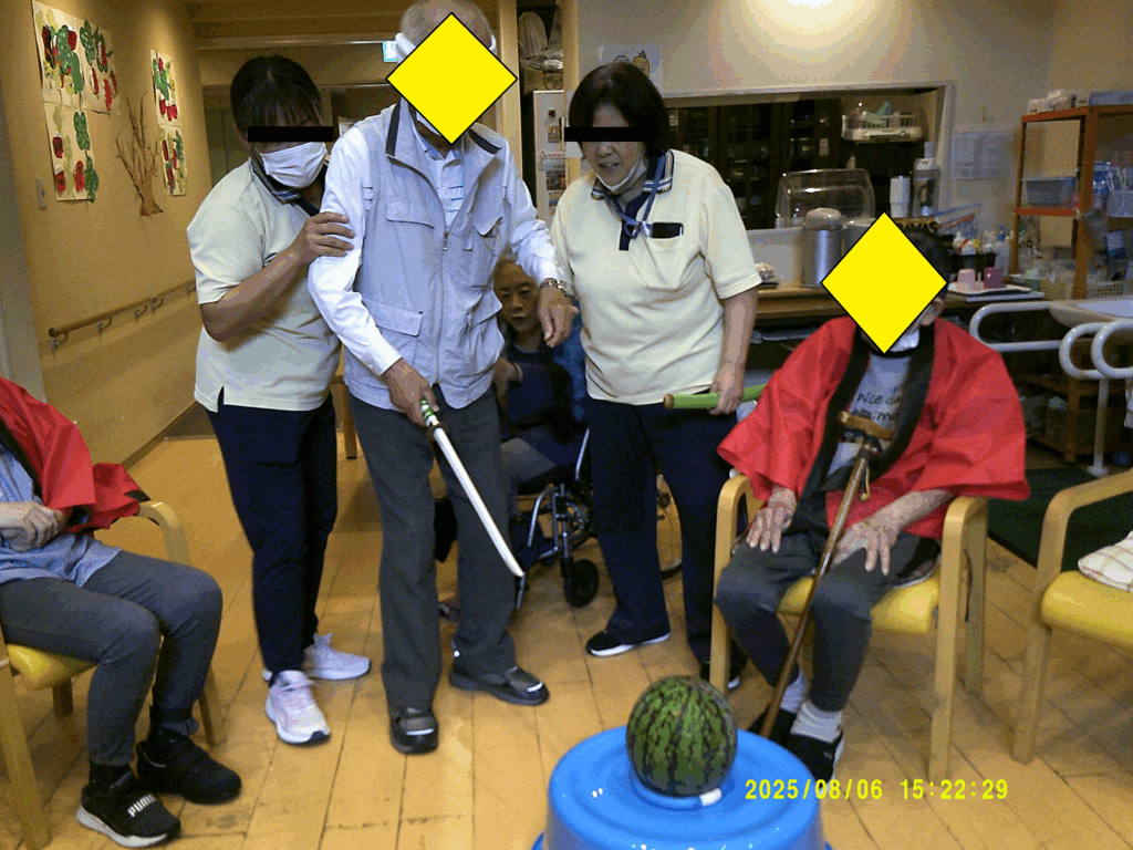 スイカ割りにも挑戦して頂きました。目隠しをしていながらも上手にスイカに棒を振り下ろしておられました。