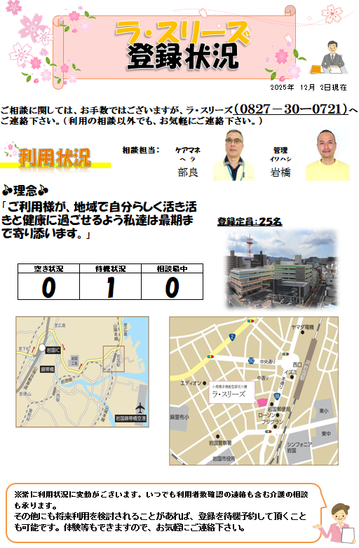 現在、空きはありませんが、流動的に空きも発生する季節です。