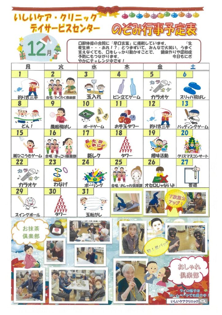 いしいケアクリニックデイサービスセンターのぞみの12月行事予定表です🤗