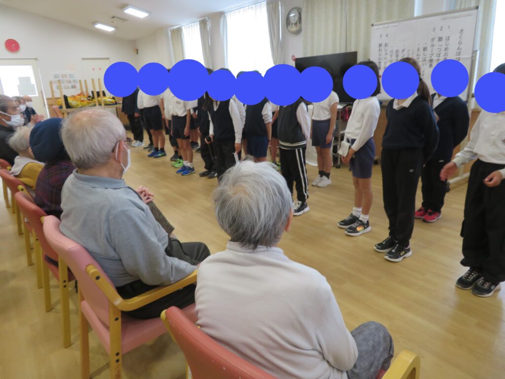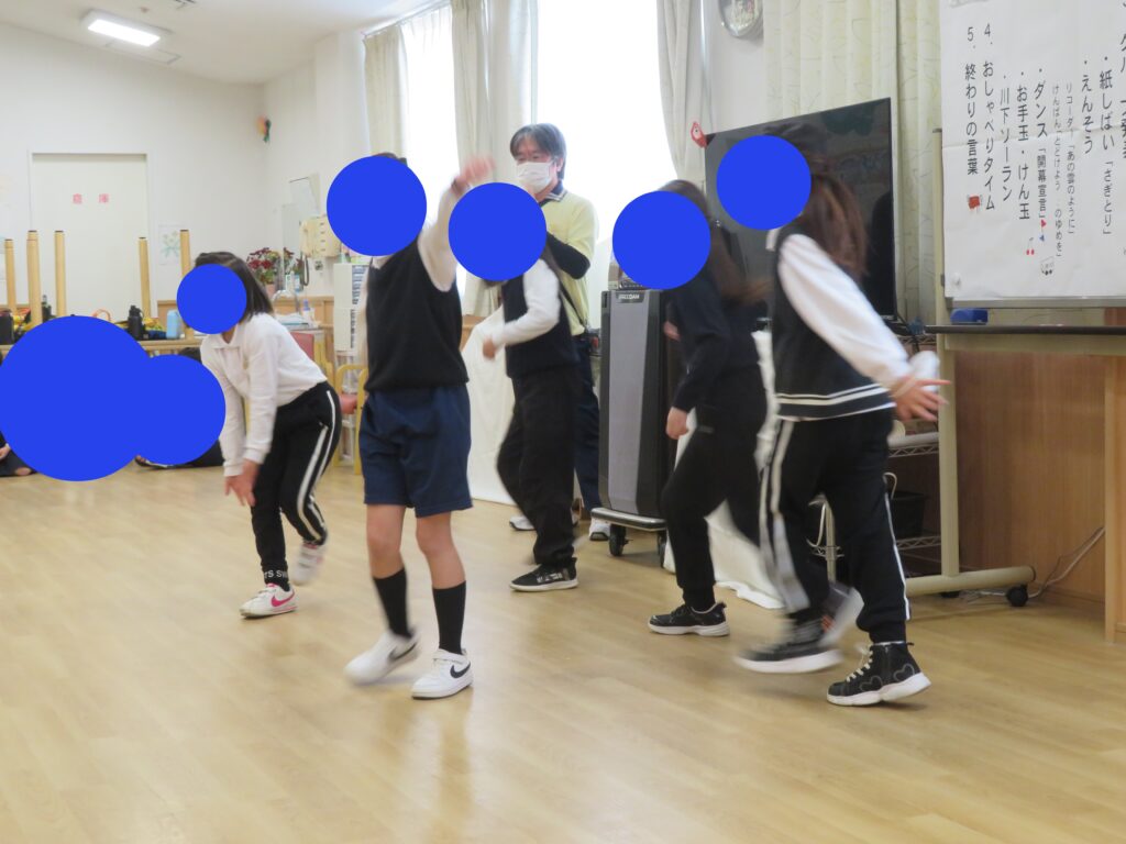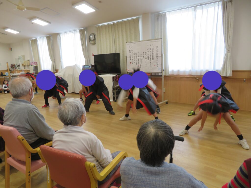 小学生の皆さんがけん玉や紙芝居・ソーラン節・ダンスを披露され、ご利用者さんも「すごいね。」と子供たちに拍手を送っておられました。