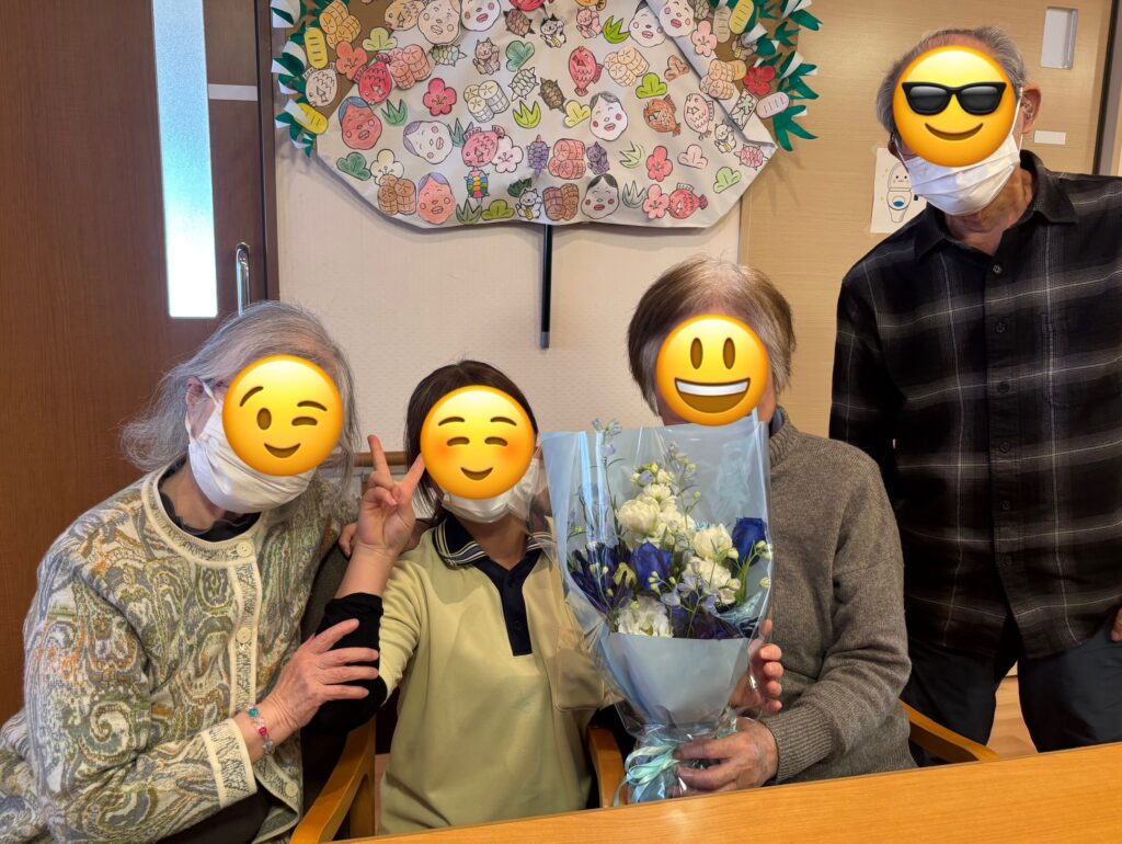 サプライズでの花束贈呈🎉 ご利用者の皆様と記念撮影です💕 おめでとうございます😘