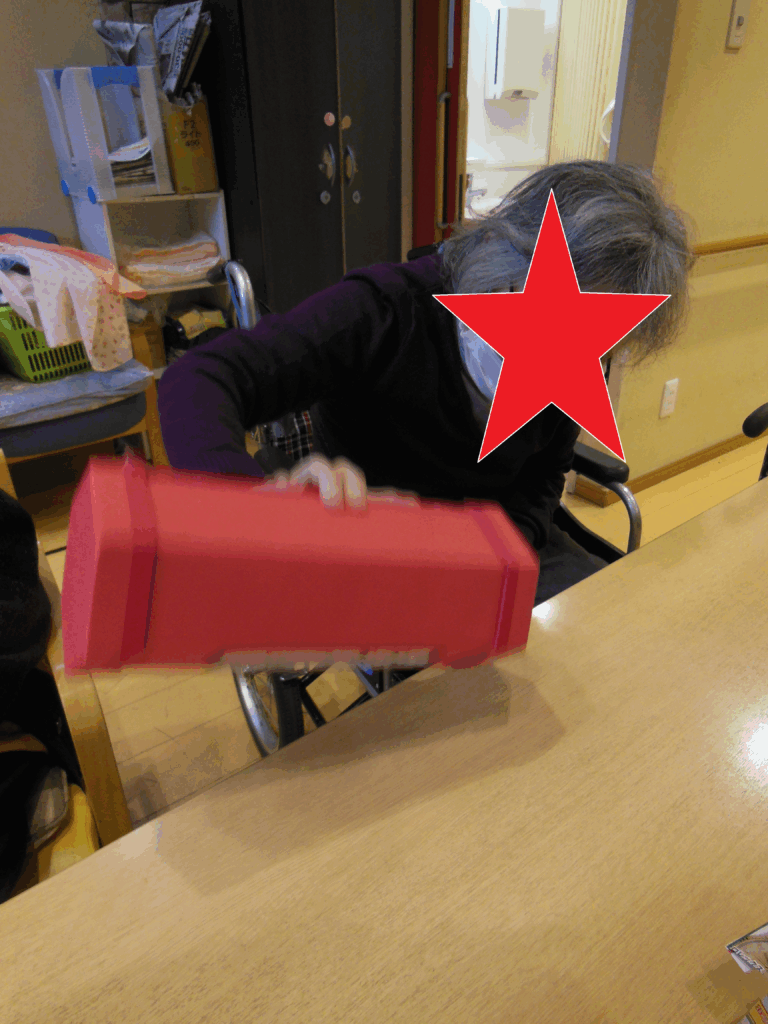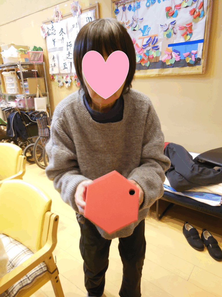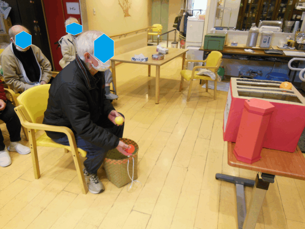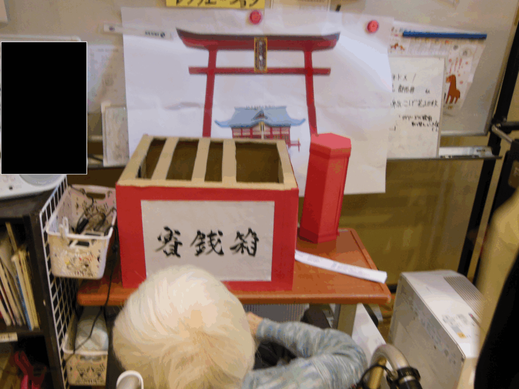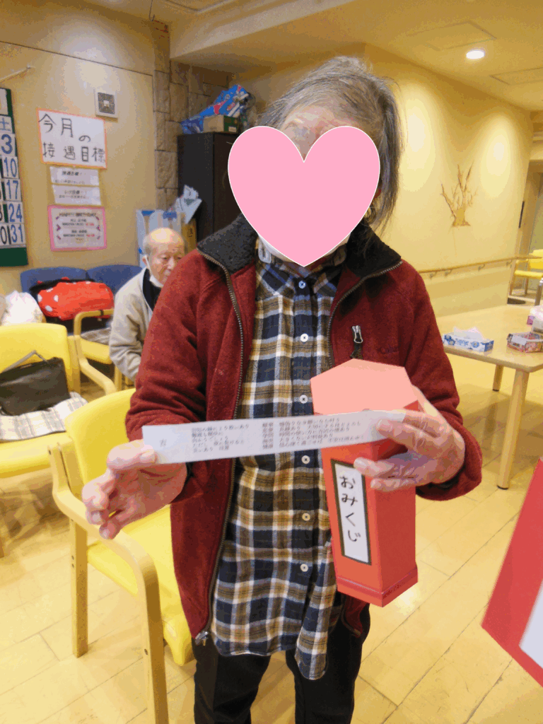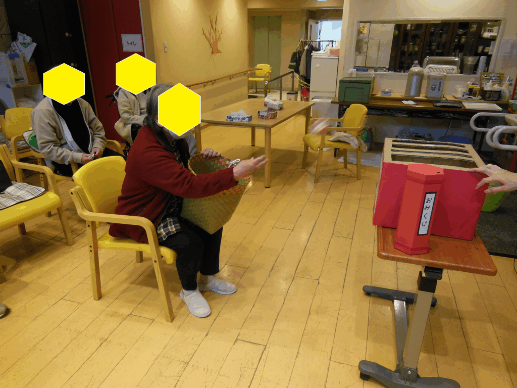 まず初めに新年と言えば初詣。今年は神社に見立てた会場を作り、手製の賽銭箱にお手玉を入れるゲームをしました。そしてこれまた手製のおみくじを用意し、玉入れの後に引いていただきました。