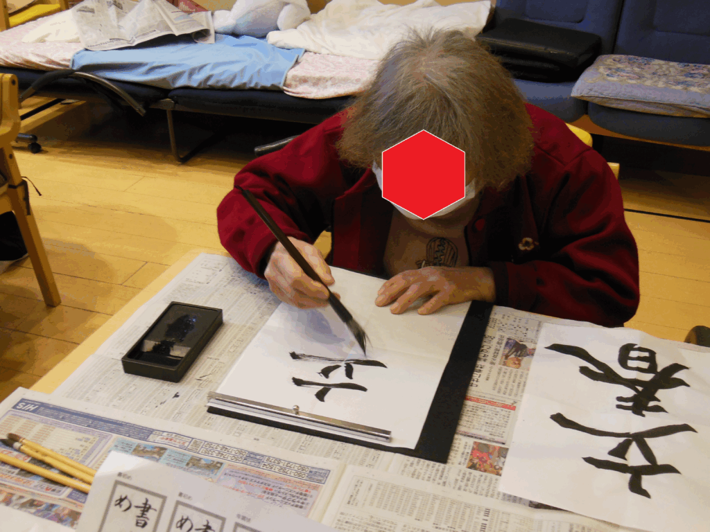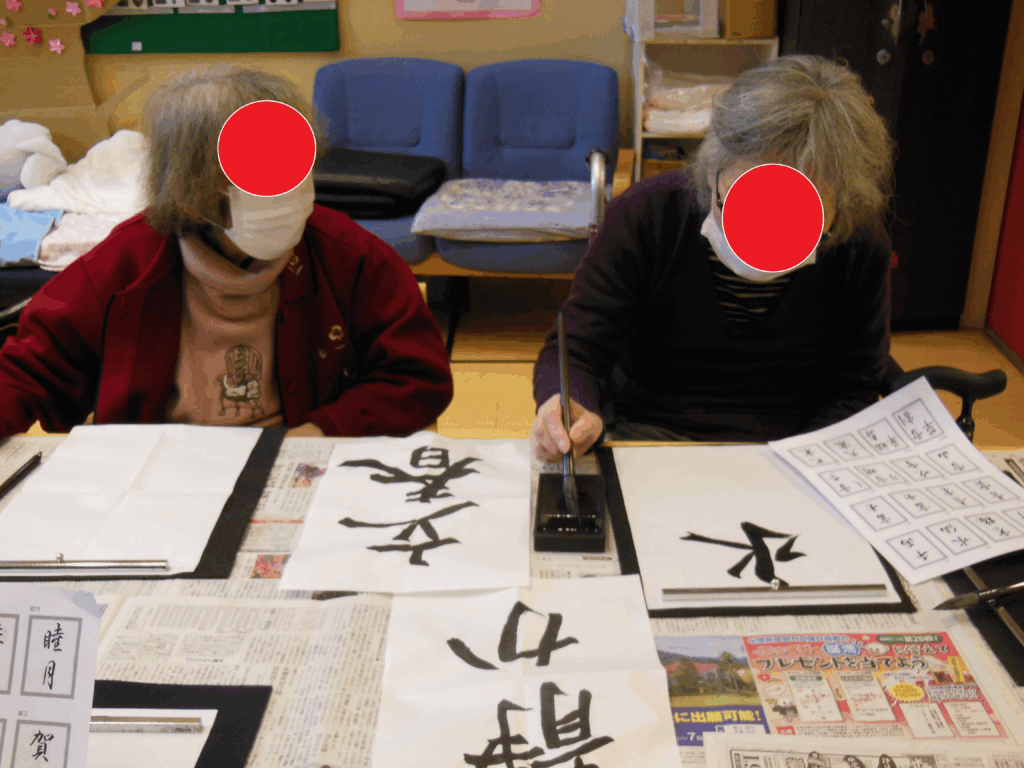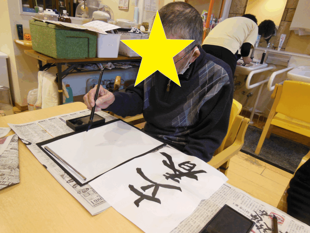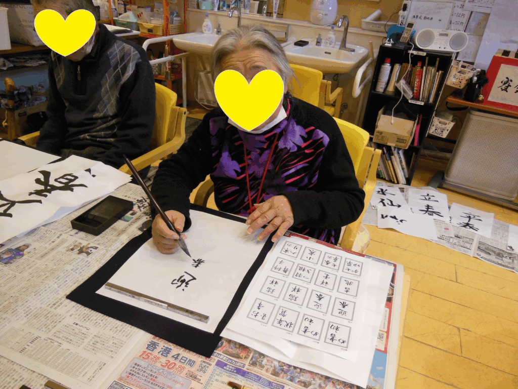 続きまして、新年といえば書初めです。さくら庵では毎月、書道で季節の言葉などを書いて頂いて
