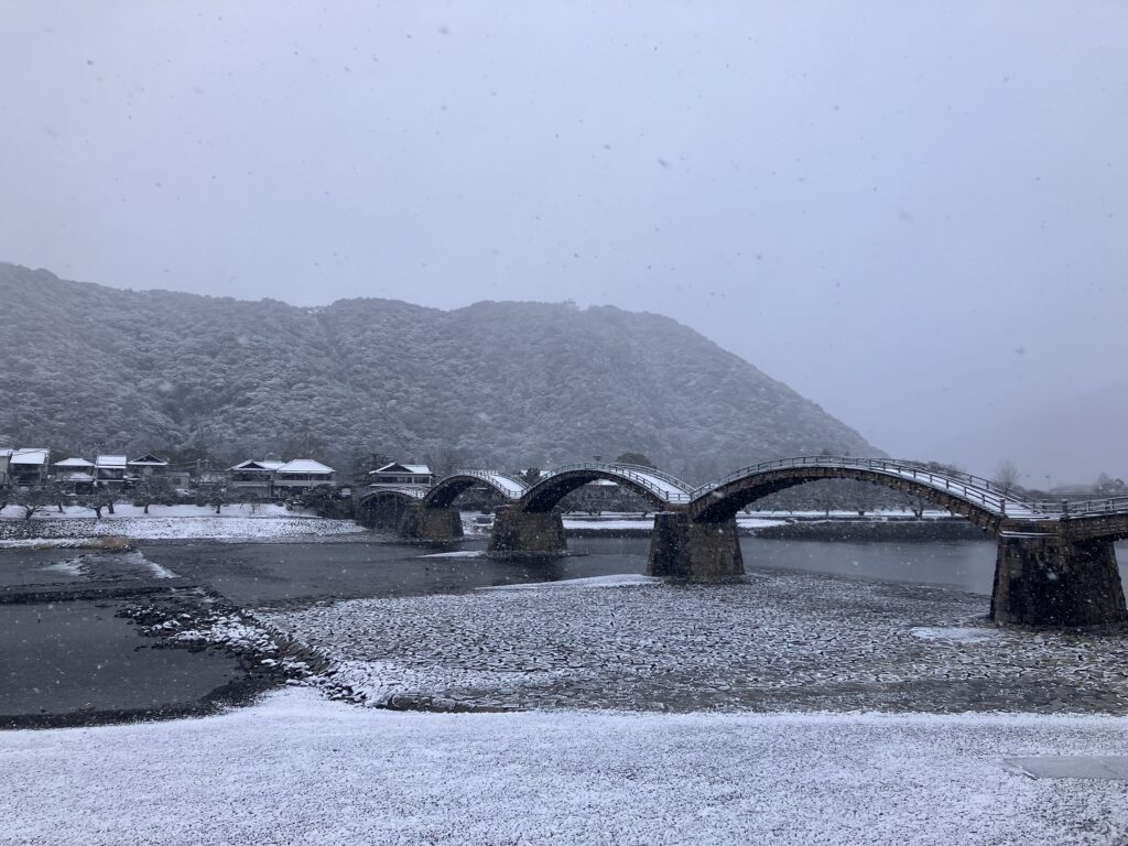 錦帯橋も雪化粧でした😮