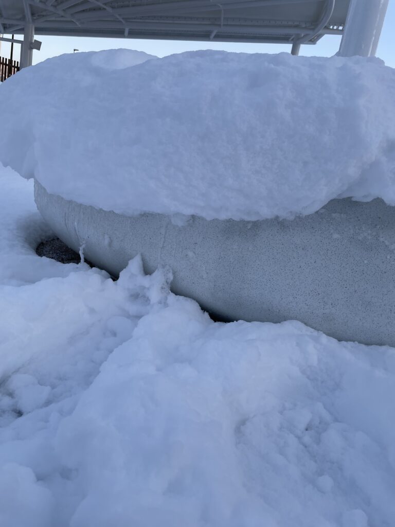 大竹駅前のベンチにも雪がかなり積もっていました。