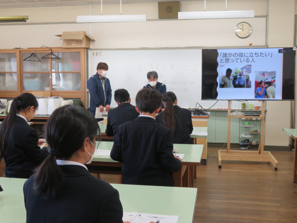 1月21日、川下中学校にいくつかの職種の中から、介護福祉士についてお話をさせていただきました。