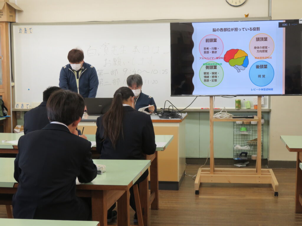 2回に分けて約20名近くの生徒さんが介護職に興味をもたれ、メモを取りながら真剣にお話を聞いてくださいました。