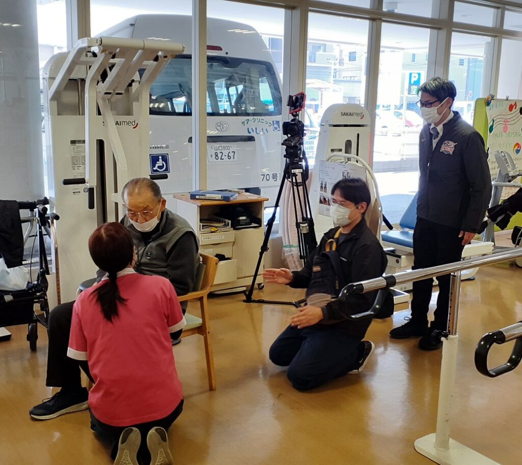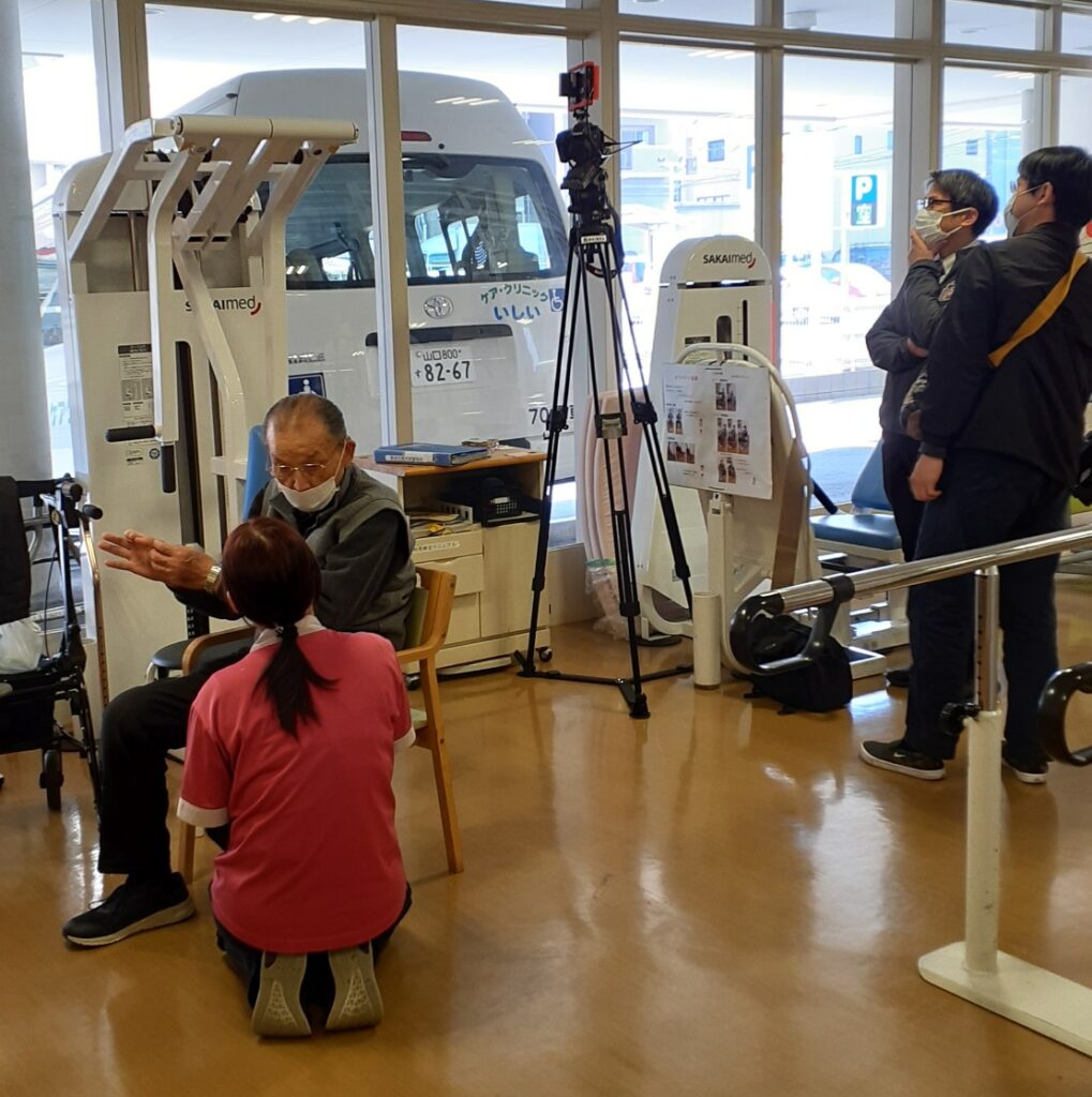 デイサービスでの日常の、ご利用者様と職員の交流の様子を撮影されるという事で、ご利用者様のおひとりと、職員が1名、撮影に応じました。